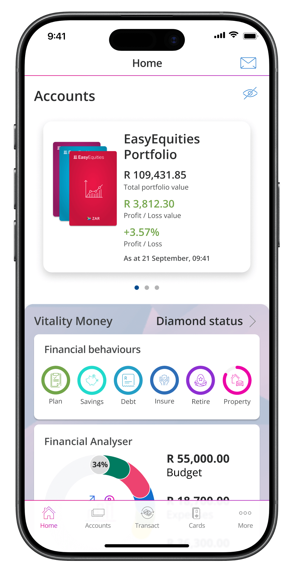 Access the EasyEquities platform to invest in shares, ETFs, property and other investments securely and conveniently through the Discovery Bank app in just a few taps. We're empowering you to manage your money well and boost your financial health.