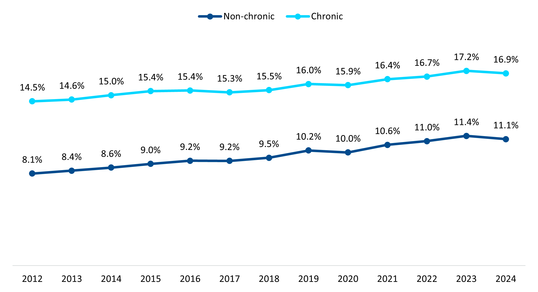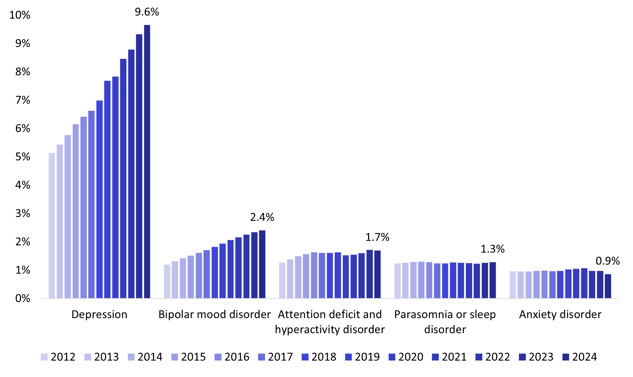Depression and bipolar mood disorder are the two fastest‑growing registered mental health conditions, with an increase of 13% and 8% each year respectively from 2012 to 2024. These two conditions outpaced the annual growth in the other top ten registered conditions in 2024, including conditions not related to mental health (Figure 6). Between 2012 and 2024, the prevalence of non‑mental health conditions grew by 9.2% per year on average. In the same period, the prevalence of mental health conditions increased by 10.2% per year on average.