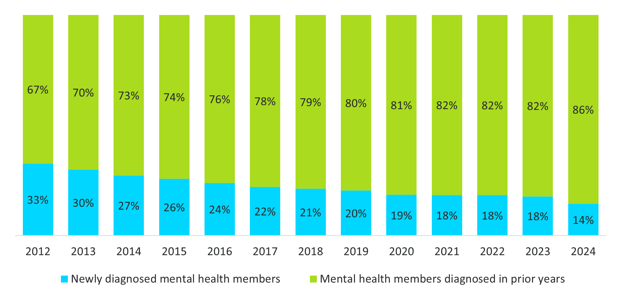 In 2024, 14% of DHMS members living with mental health conditions claimed or registered for the first time (in other words, they could be considered 'newly diagnosed'). 86% of the population has had mental health conditions for 1 year or more, reflecting ongoing claims and re‑registrations for these conditions. Figure 5 shows a growing trend in the proportion of this population with a previous mental health condition claim or registration.