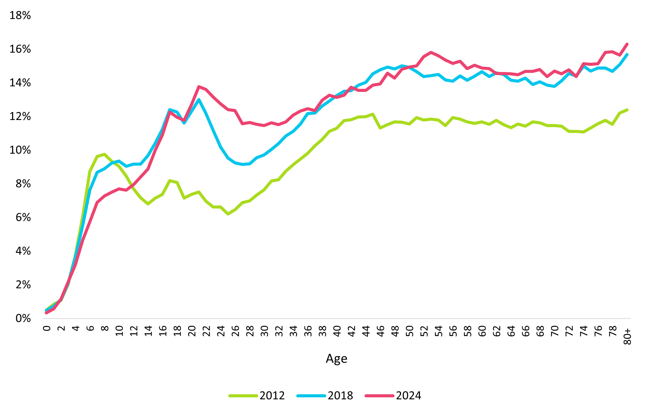 Figure 4 shows the prevalence of mental health conditions in DHMS members split by age from 2012 to 2024. There is a noticeable spike in the number of young adults (ages 18 to 24) registering or claiming for a mental health condition, with the prevalence of mental health conditions in this age group more than doubling since 2012