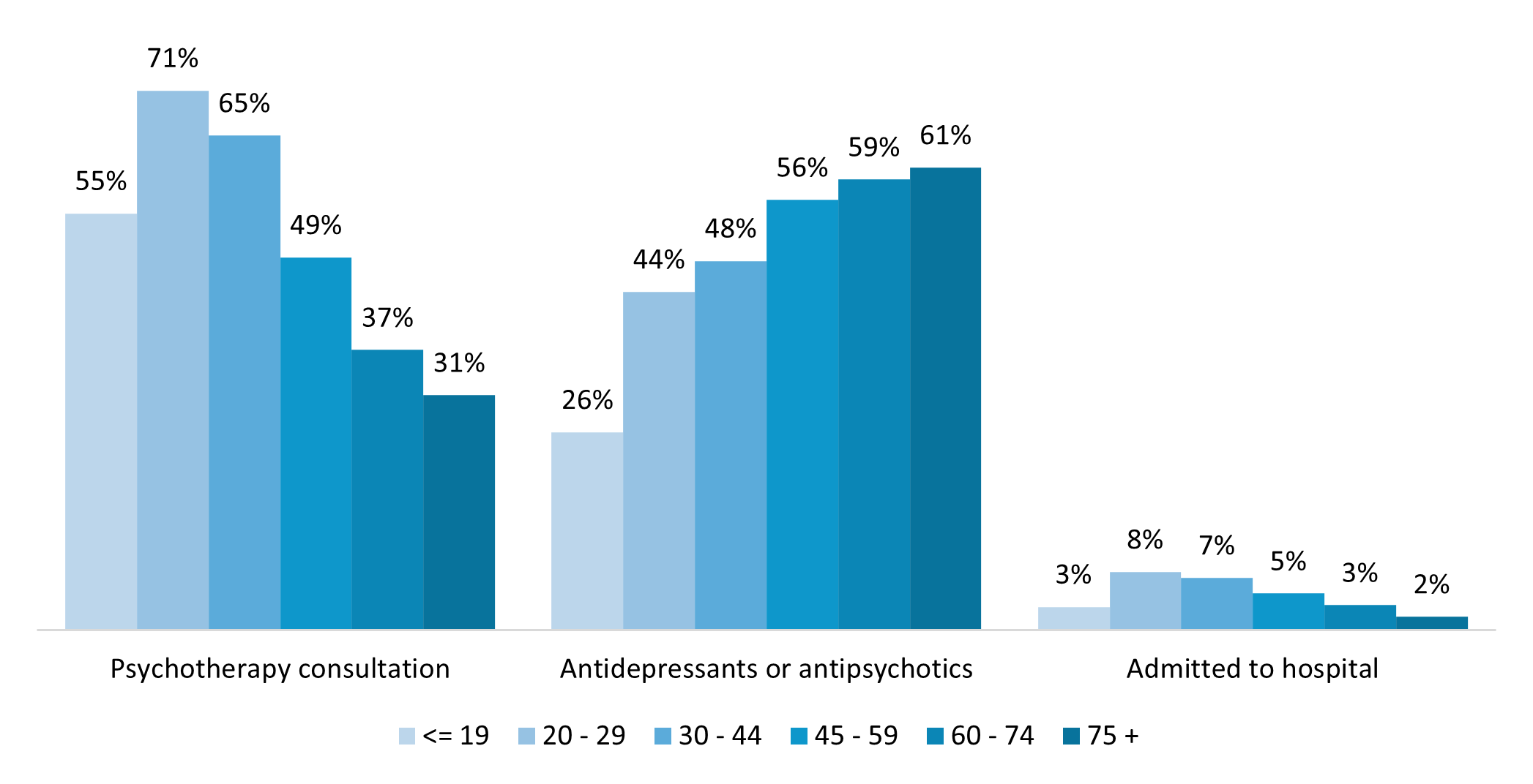 This shows that health‑seeking behaviour in the mental health population differs by age, with younger members claiming more for psychotherapy and older members claiming more for mental health‑related medicine.