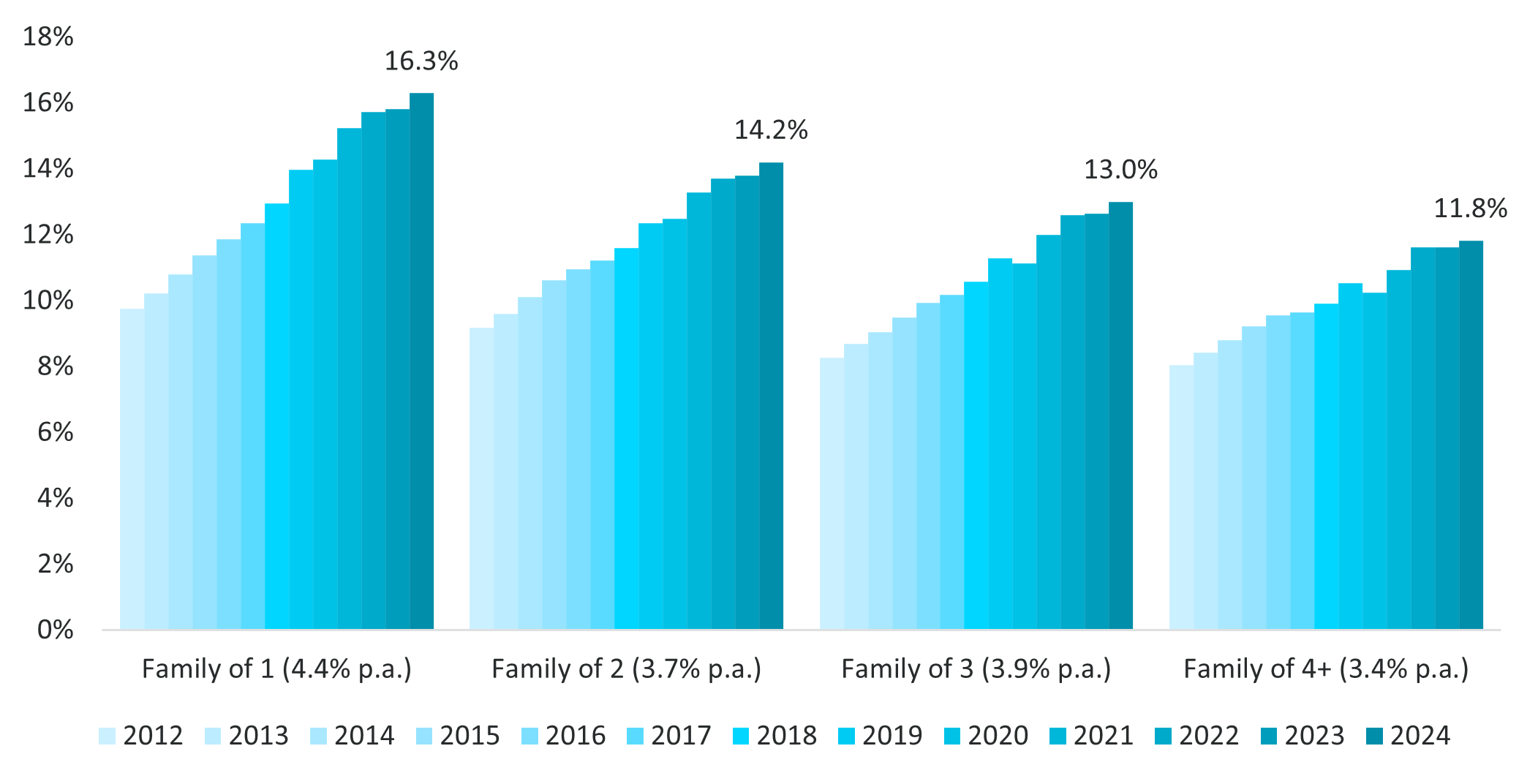 Family size is decided by the number of beneficiaries listed on a DHMS policy. Figure 7 shows that mental health conditions were more prevalent among members with single policies compared to those with larger policy sizes. In 2024, single policies had 1.38 times higher prevalence of mental health conditions compared to policies with four or more people (16.29% for single family size vs 11.82% for family of four, Figure 7). This observation is influenced by age: young adults are often on a single policy, while older members and children are typically part of larger policy sizes. Loneliness and isolation are known clinical triggers for a mental health episode, and family size is a useful indicator of a mental health condition depending on whether there are supportive relationships within the family.2