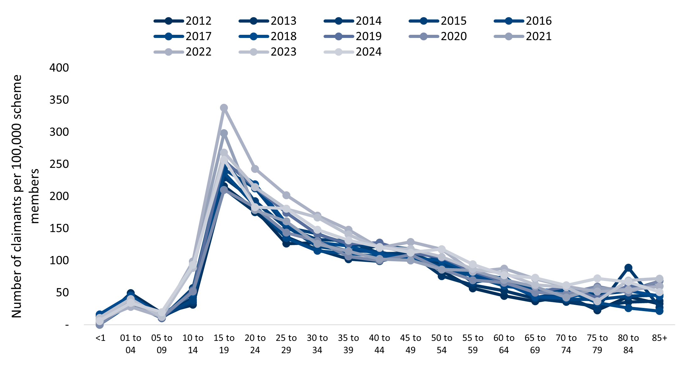Figure 6: Number of DHMS members claiming for an ICD‑10 code associated with intentional suicide or self‑harm per 100,000 distinct lives by age
