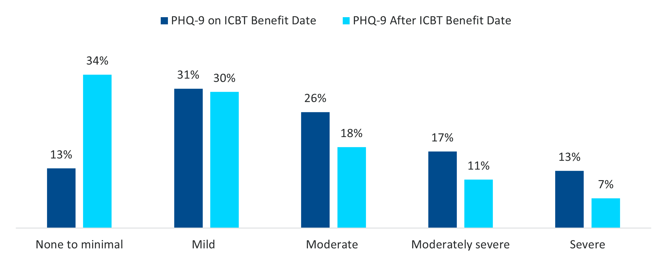 In DHMS members who took up this benefit and completed a PHQ‑9 assessment before and after the course, we have seen an improvement in PHQ‑9 scores after finishing the ICBT. Before the programme started, 56% of members had moderately severe to severe self‑reported depression symptoms. This is compared to only 35% of members after finishing the course (Figure 9). This digital solution offers cost‑effective, clinically validated and accessible mental healthcare.