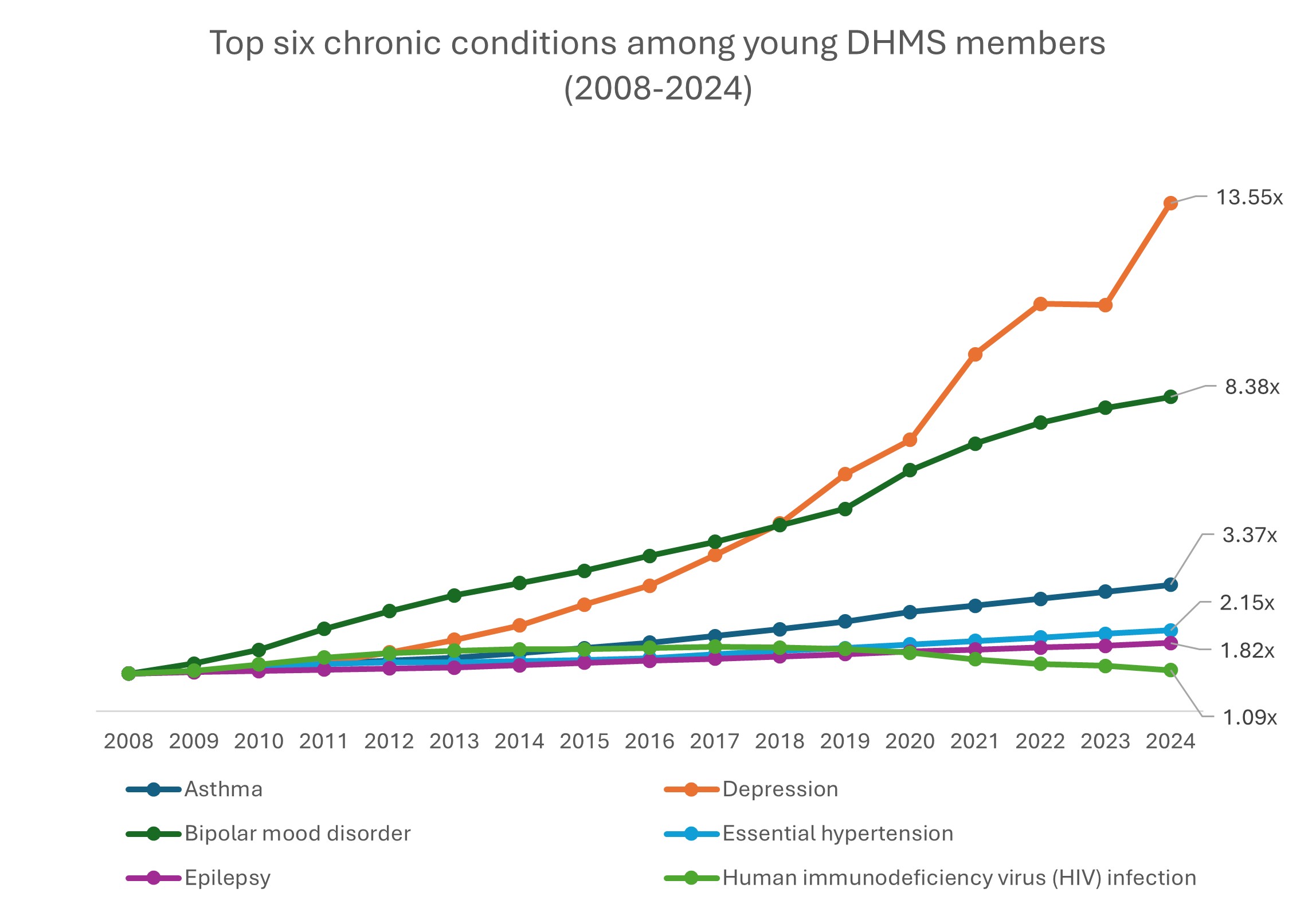 Figure 8: Chronic condition prevalence (2008-2024) for the six conditions most prevalent among young members in August 2024 (indexed to August 2008, i.e. values in the graph are multiples of that condition's prevalence in August 2008).