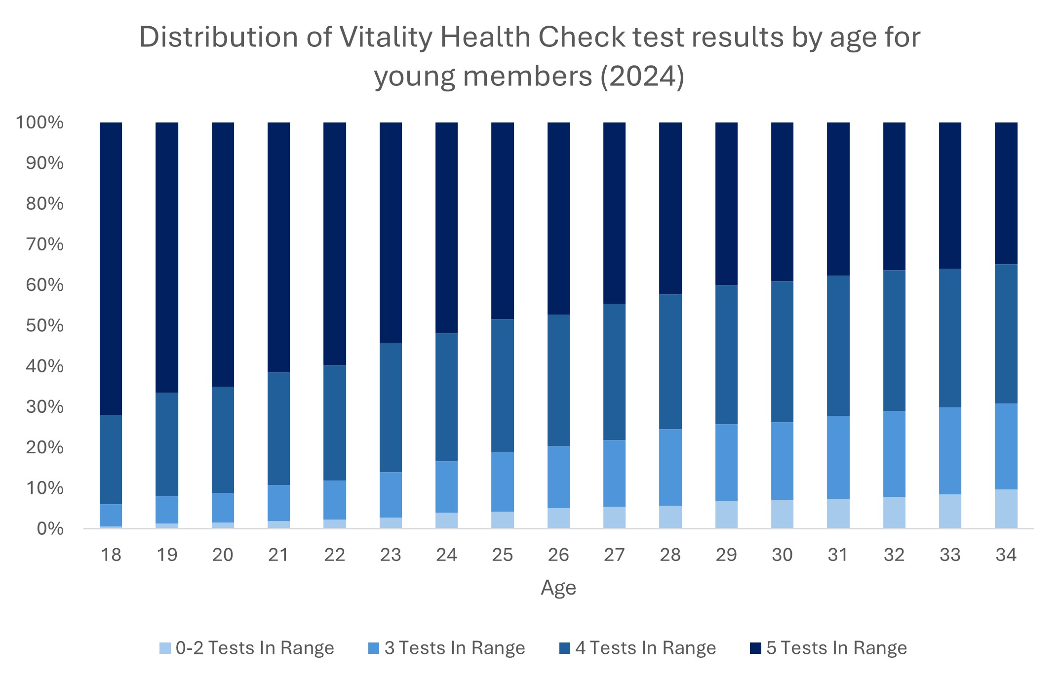 Figure 5: The number of in-range Vitality Health Check results in young Scheme members by age (across ages 18 to 34) in 2024, showing that most young people have four or five results in range.