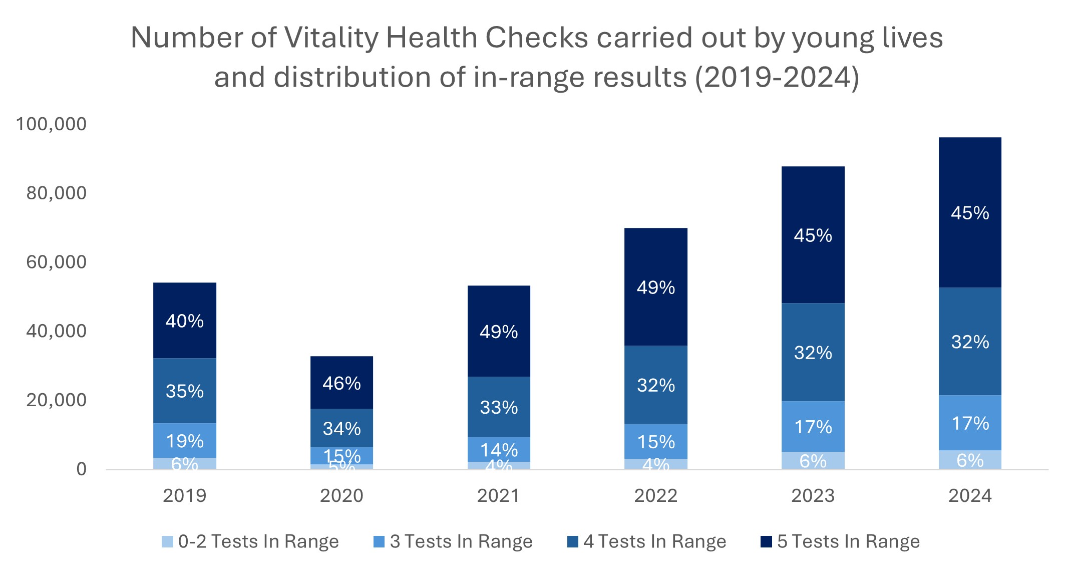 Figure 4: Vitality Health Checks carried out by young DHMS members from 2019 to 2024 with the proportion of in-range results (from zero to five test result options) indicated for each year.