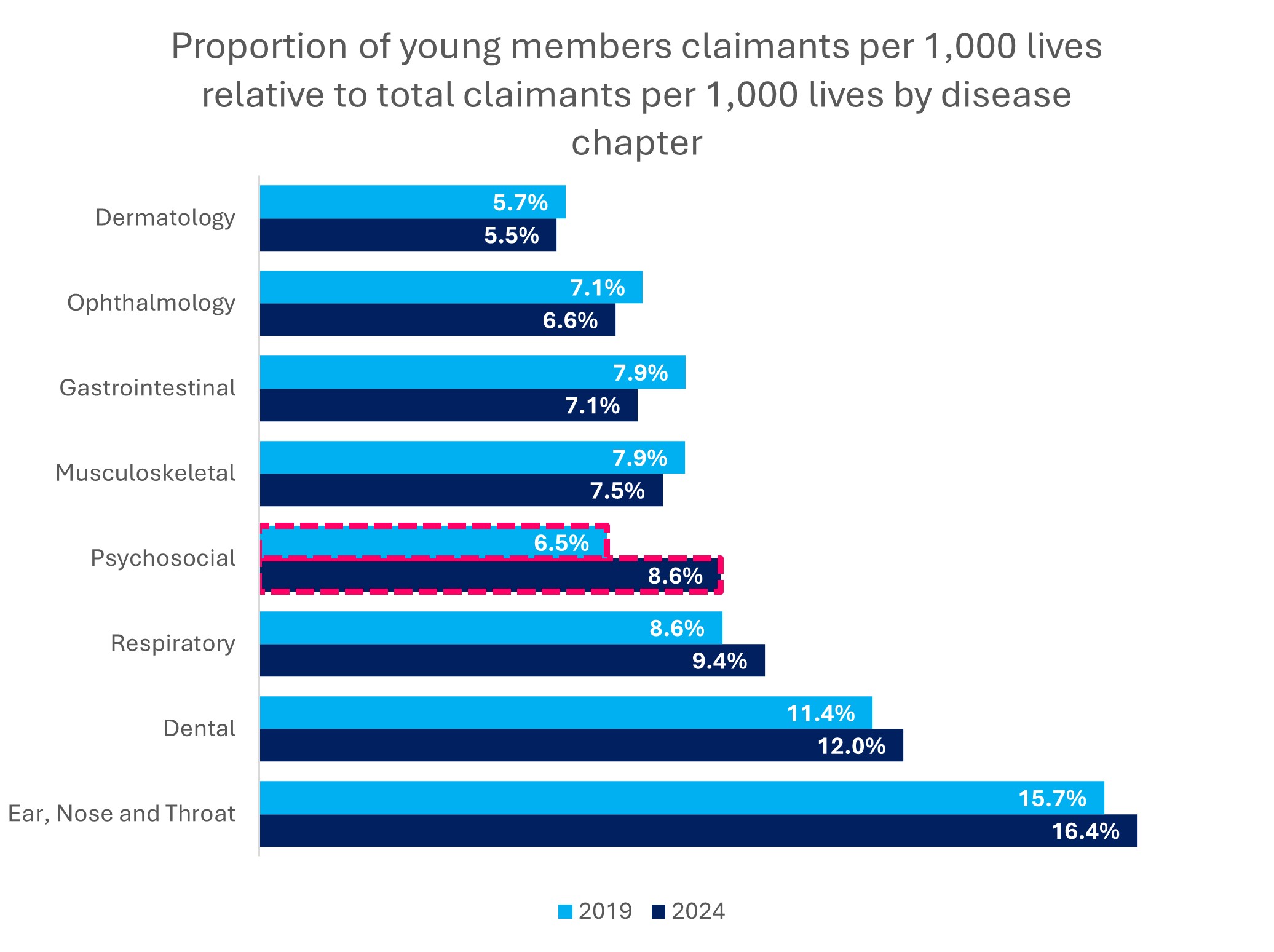 Figure 9: Proportion of claims by young members relative to total claims, across the top disease chapters claimed for by young members, and comparing 2019 to 2024.