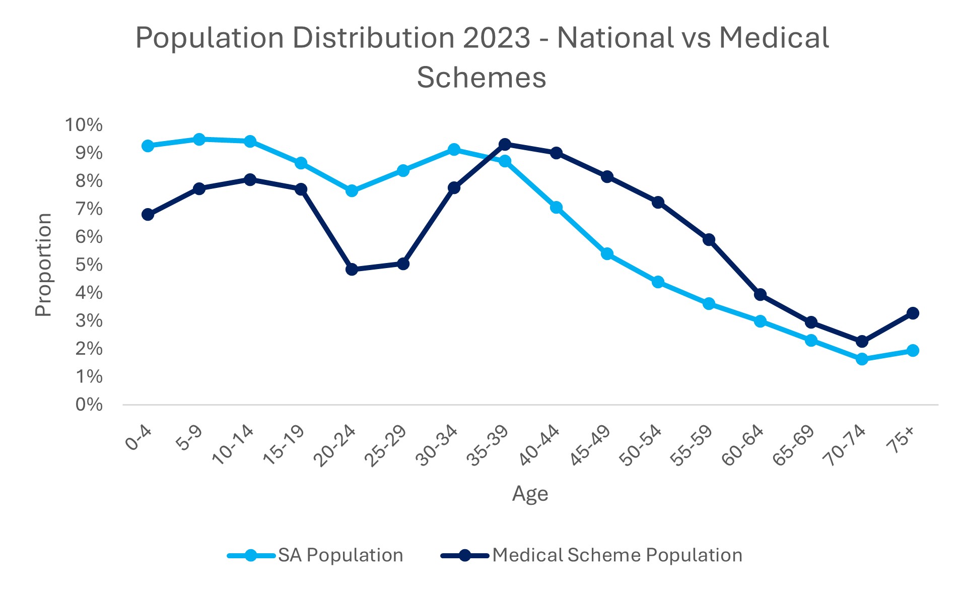 Figure 1: Age distribution of overall South African population and South African medical scheme membership (Source: General Household Survey 2023).