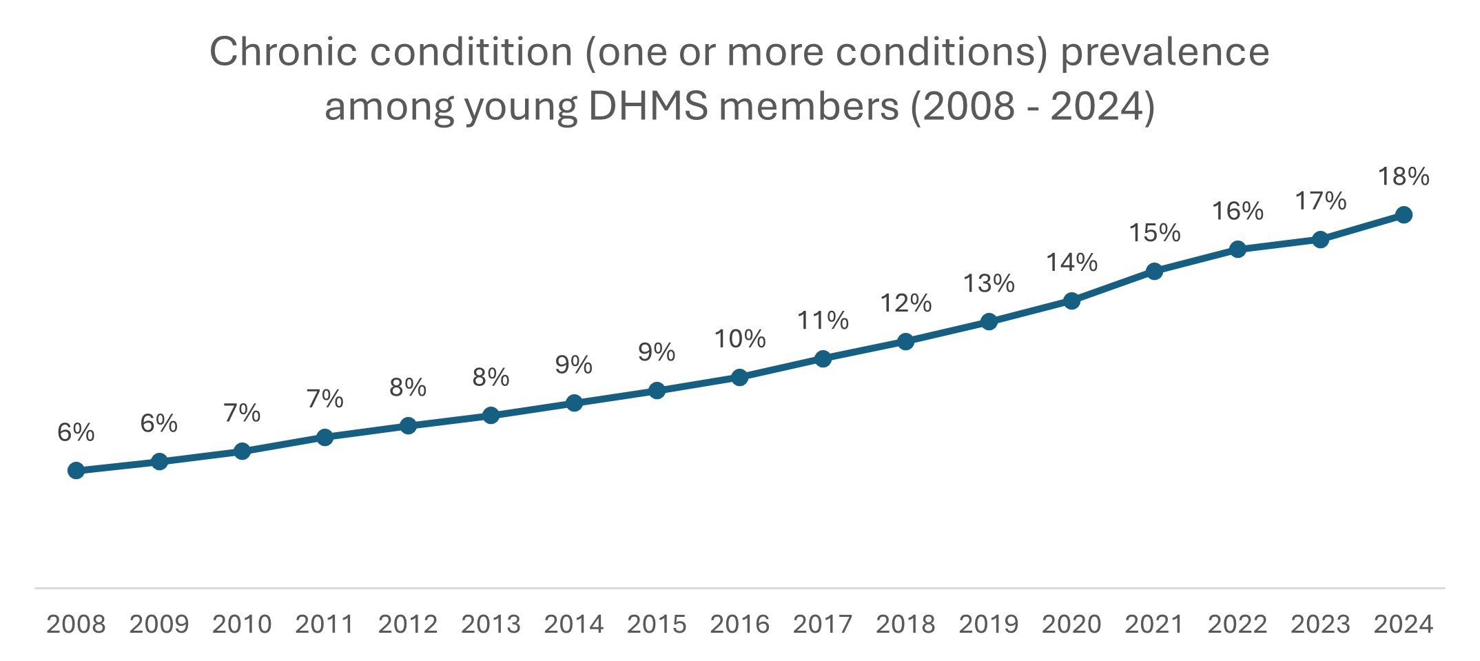 In August 2024, almost one-fifth, or 18%, of DHMS young members were registered for one or more chronic conditions, a tripling from 6% in 2008 (measured by registration for the Chronic Disease List as part of the Prescribed Minimum Benefits for the Chronic Illness Benefit).