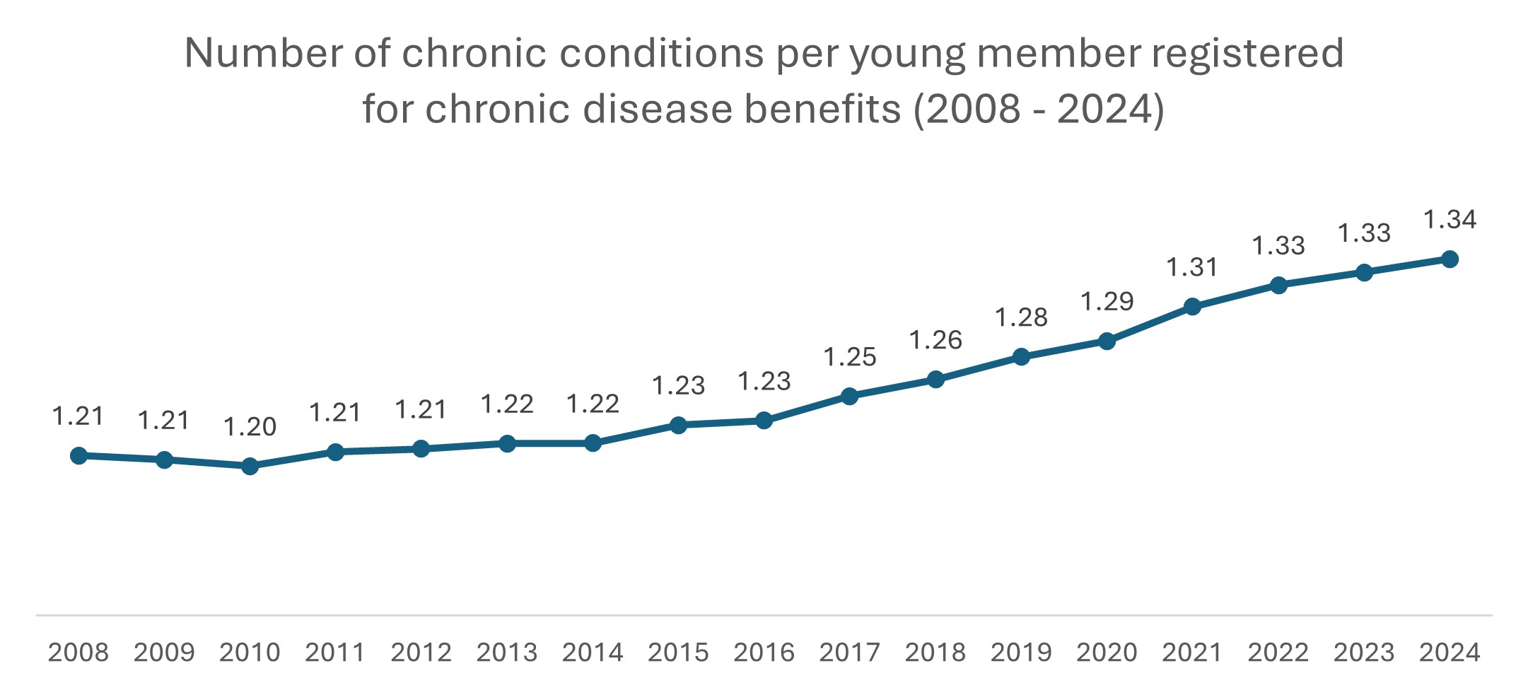 Figure 6: Average number of registered chronic conditions per chronic young member over the period 2008-2024.