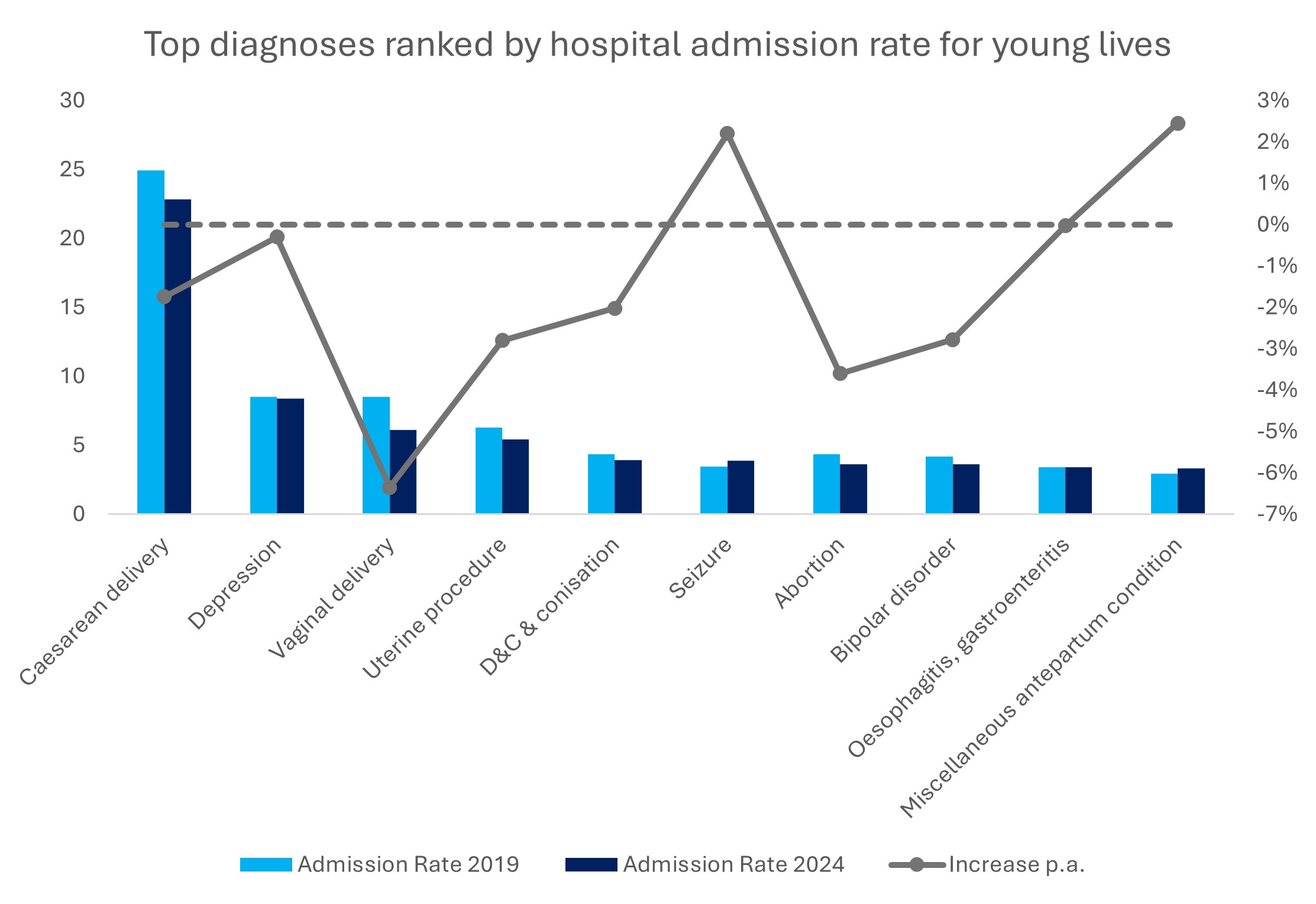 - Seizures experienced a 2.2% increase in admission rate - influenced by rising prevalence of neurological disorders such as epilepsy and accompanying mental health conditions amongst young lives.