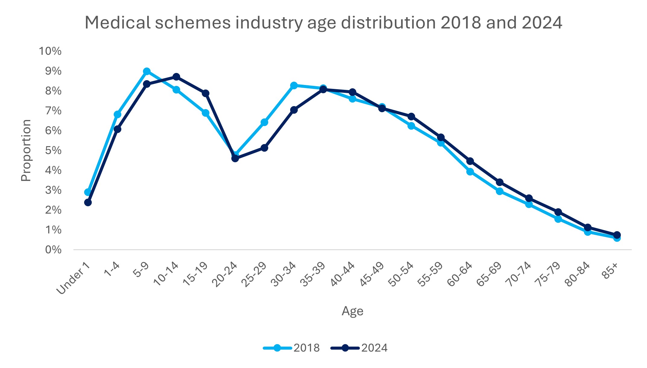 In recent years, there has been a reduction in the number of babies added to the medical scheme as members. This drives the reduction seen in the proportion of child members over time. Children who were medical scheme members over a decade ago have retained their cover and become teenagers, for whom we see increased representation on medical schemes - the 2024 membership proportion is higher than in 2018 for ages 10 to 19, as shown in Figure 2.