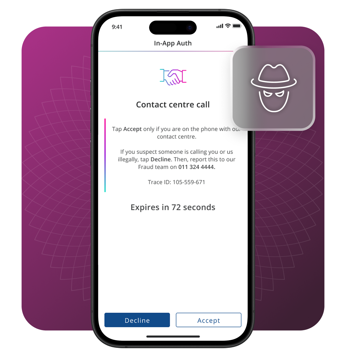 You'll get an in-app authorisation message when you've called Discovery Bank or when we've called you about a query. Only approve the message if you're on the phone with the Discovery Bank contact centre. If you suspect someone has contacted you or us illegally, please decline the message and report it to our Fraud team on 011 324 4444.