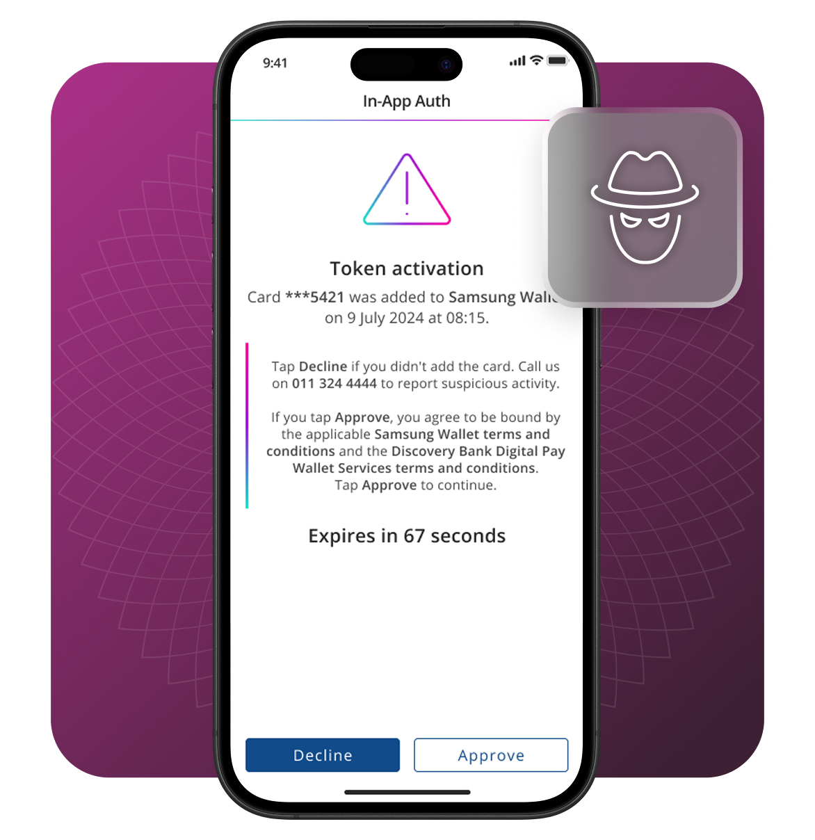 Similarly, you'll get an in-app authorisation message when your Discovery Bank card is added to a Samsung Wallet. This message will show the card number, the wallet brand, date and time. Tap Decline if you didn't add your card or if anything is wrong. Please also call our Fraud team on 011 324 4444 to report this. When you tap Approve, you agree to be bound by the applicable Samsung Wallet terms and conditions and the Discovery Bank Digital Pay Wallet Services terms and conditions.
