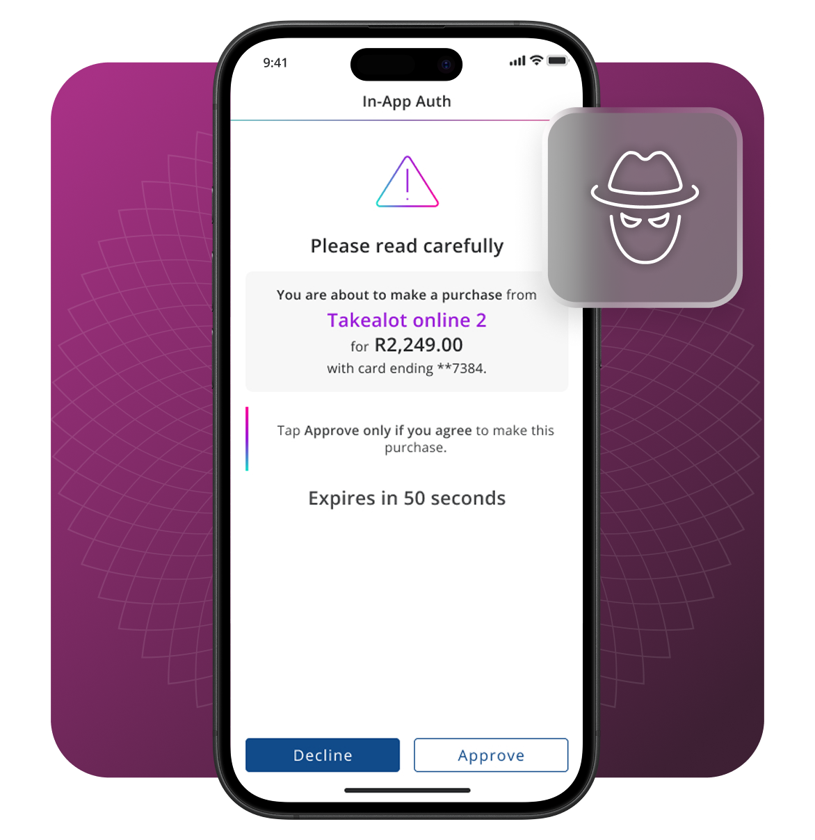 When buying online, you'll get an in-app authorisation message prompting you to confirm the purchase. It will show the merchant's name, amount, last four digits of your Discovery Bank card, date, and time. Approve the message to complete the purchase or decline if any details are incorrect or fraudulent.