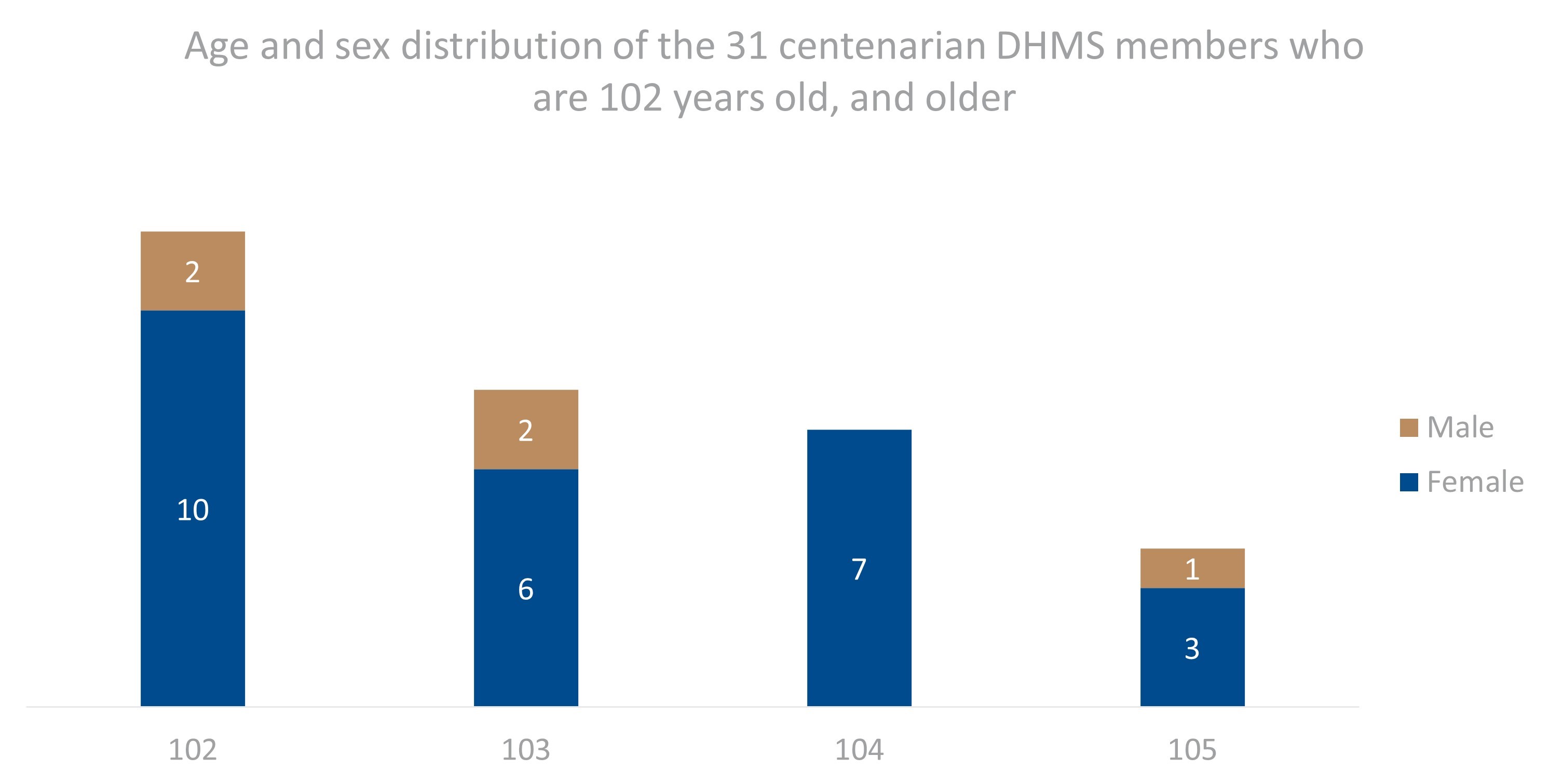 Figure 1. Age and sex distribution of the 31 centenarian DHMS members aged 102 to 105