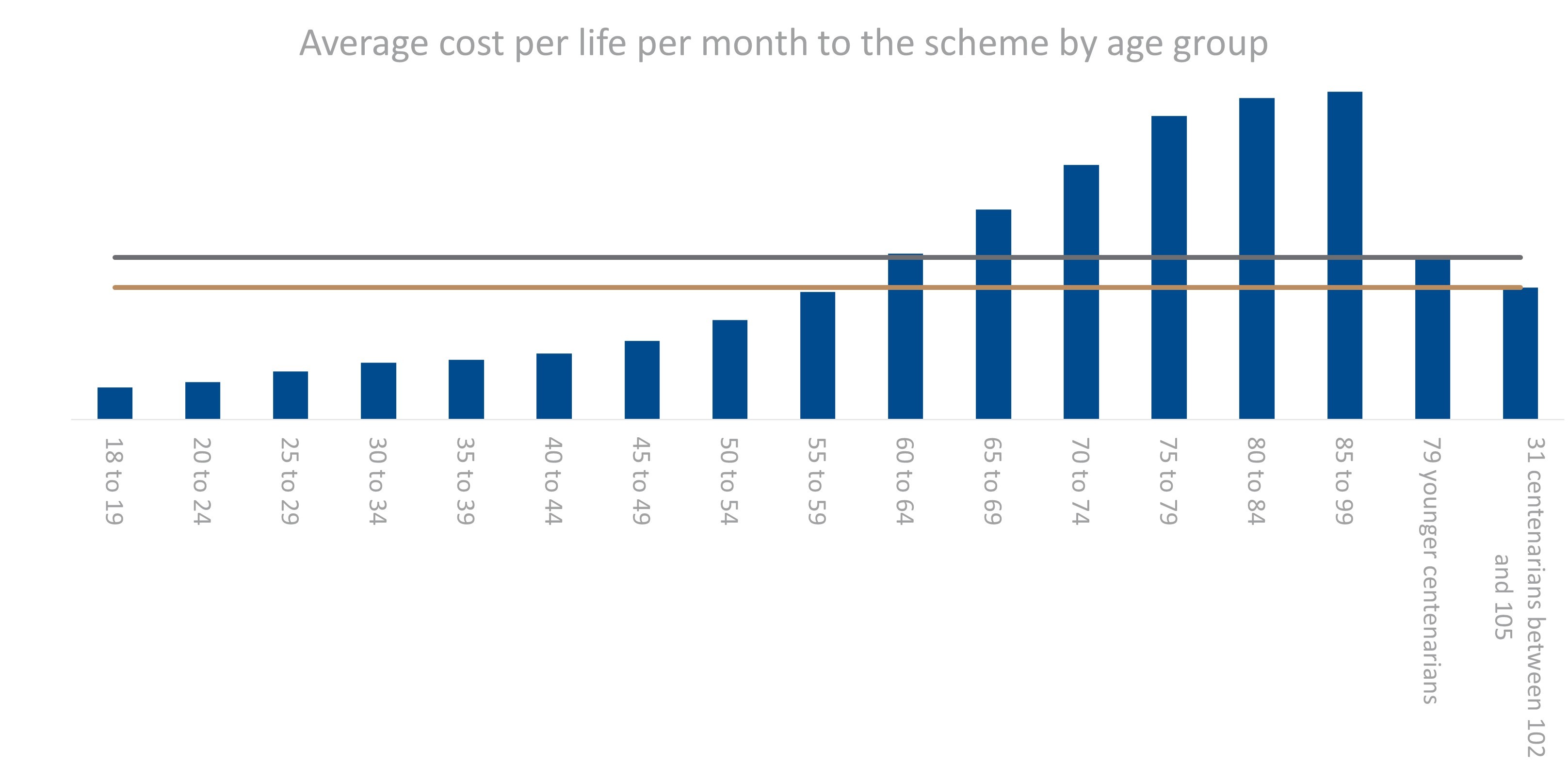 Figure 6. Average cost per life per month to the scheme by age group across the DHMS members base in the past year (May 2024 - May 2025).