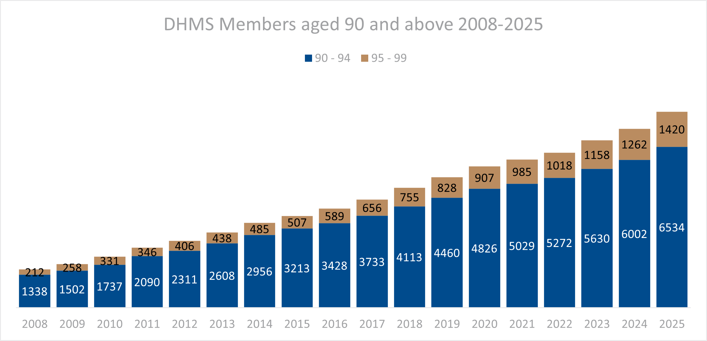 As of May 2025, we have 7,954 members over the age of 90 (294 per 100,000 DHMS members) - up from 1,550 (81 people per 100,000) in 2008. This represents a 5.13-fold increase in absolute terms and a 3.54-times higher prevalence.