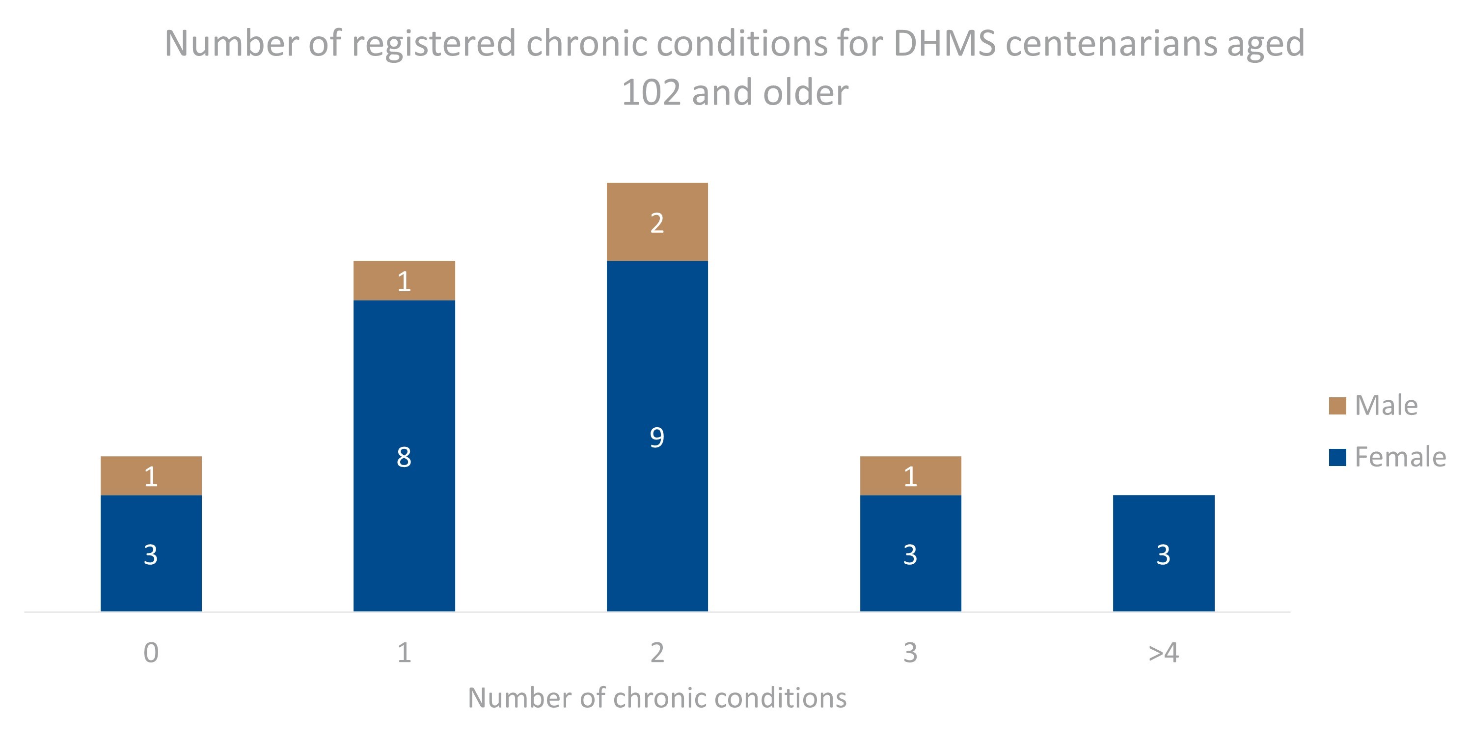 Another trend, one that has remained consistent across our 2023 and 2025 updates, is that there are far more centenarian females than males (88 vs 22 in 2025). However, the males in the group are healthier than the females, with fewer registered chronic conditions.