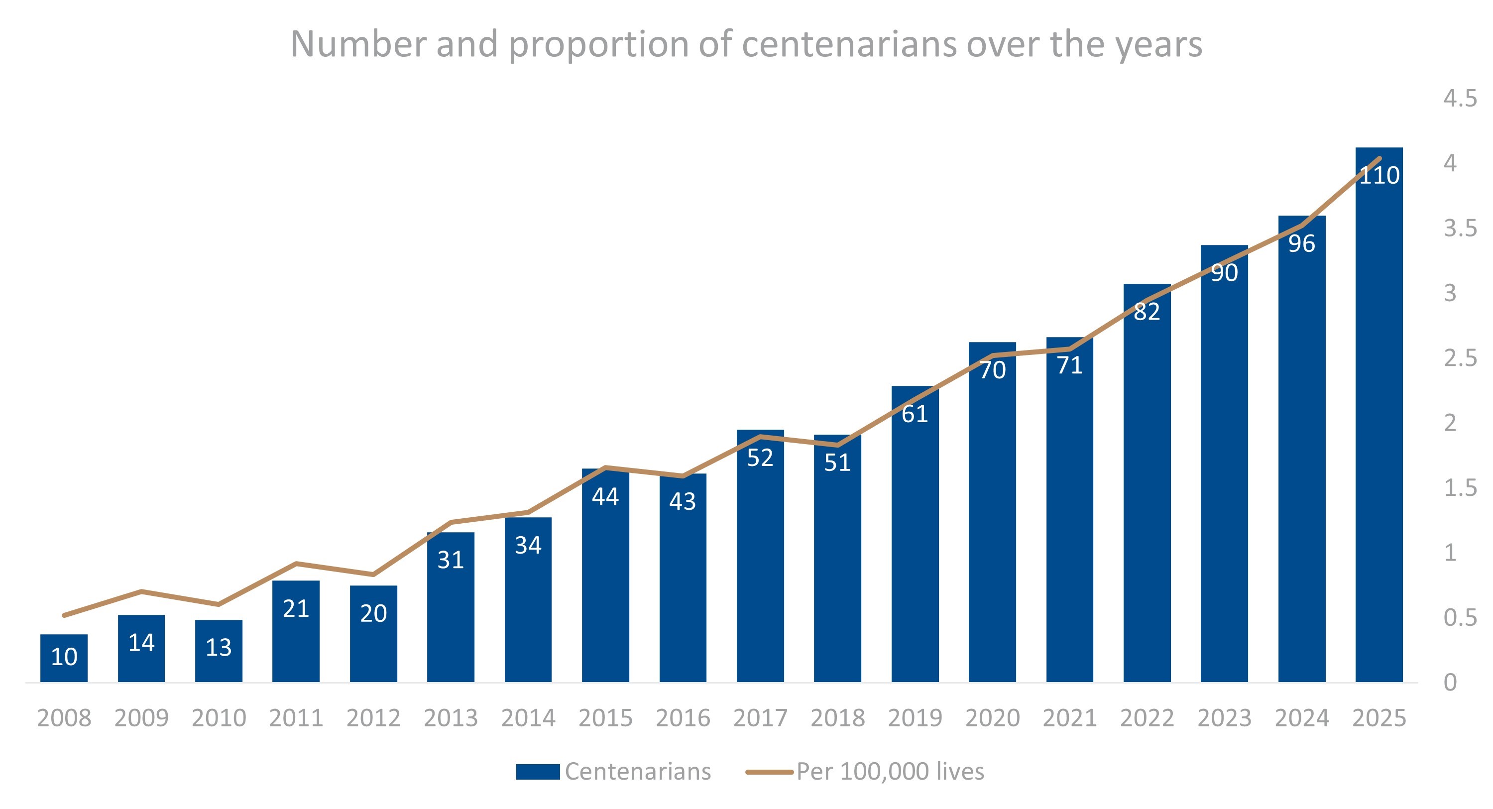 Figure 7: Number and proportion of centenarians between 2008 and 2025