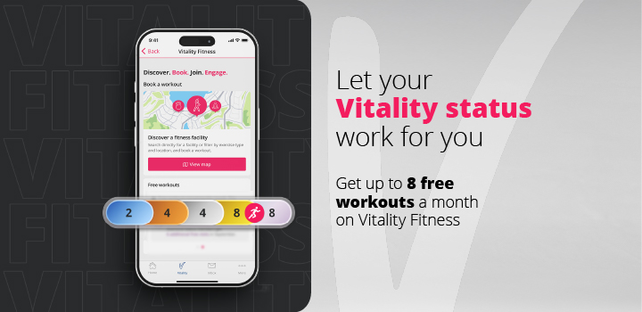 From October, you can earn up to 8 free workouts a month on the Vitality Fitness platform based on your Vitality Health status. You already get 2 free workouts a month, because we love rewarding you and now you can get up to 6 additional free workouts based on your Vitality Health status.